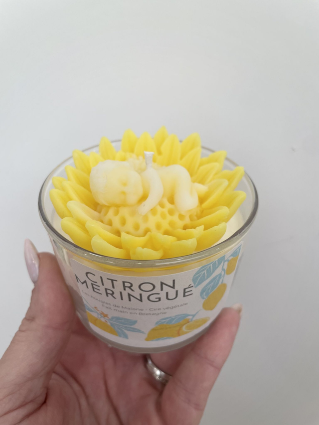 Coulée à la main avec de la cire végétale de soja-coco et un parfum de Grasse, elle diffuse le parfum de Citron meringué.