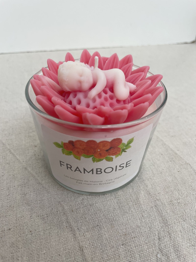 Coulée à la main avec de la cire végétale de soja-coco et un parfum de Grasse, elle diffuse le parfum de Framboise.